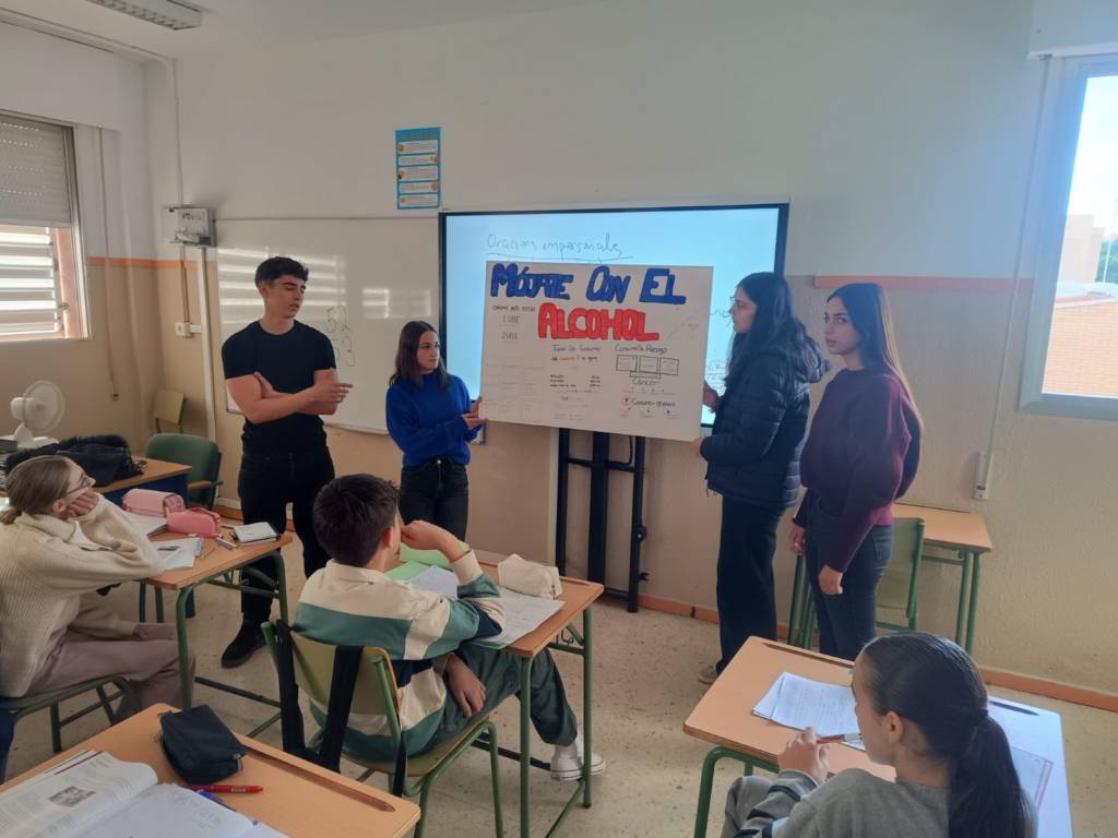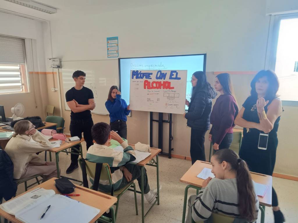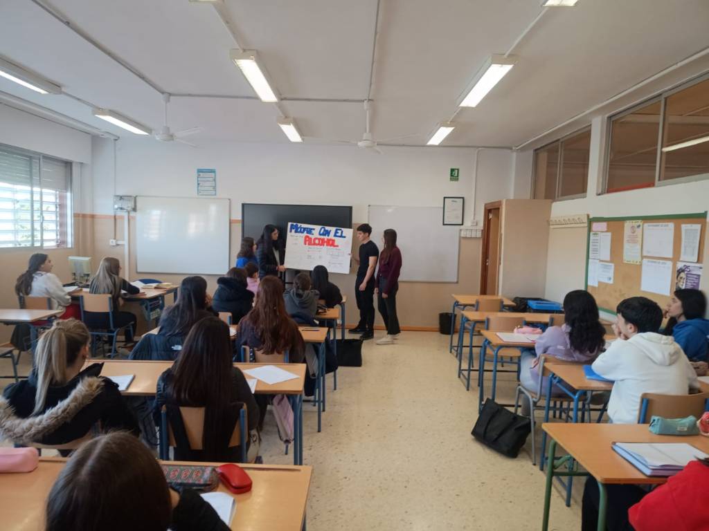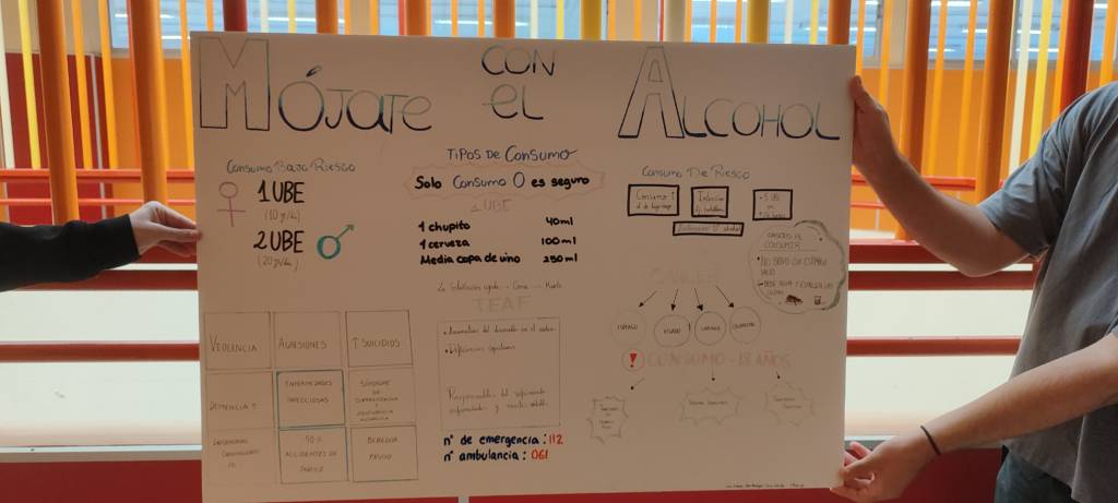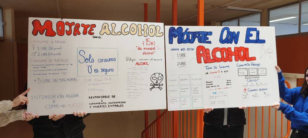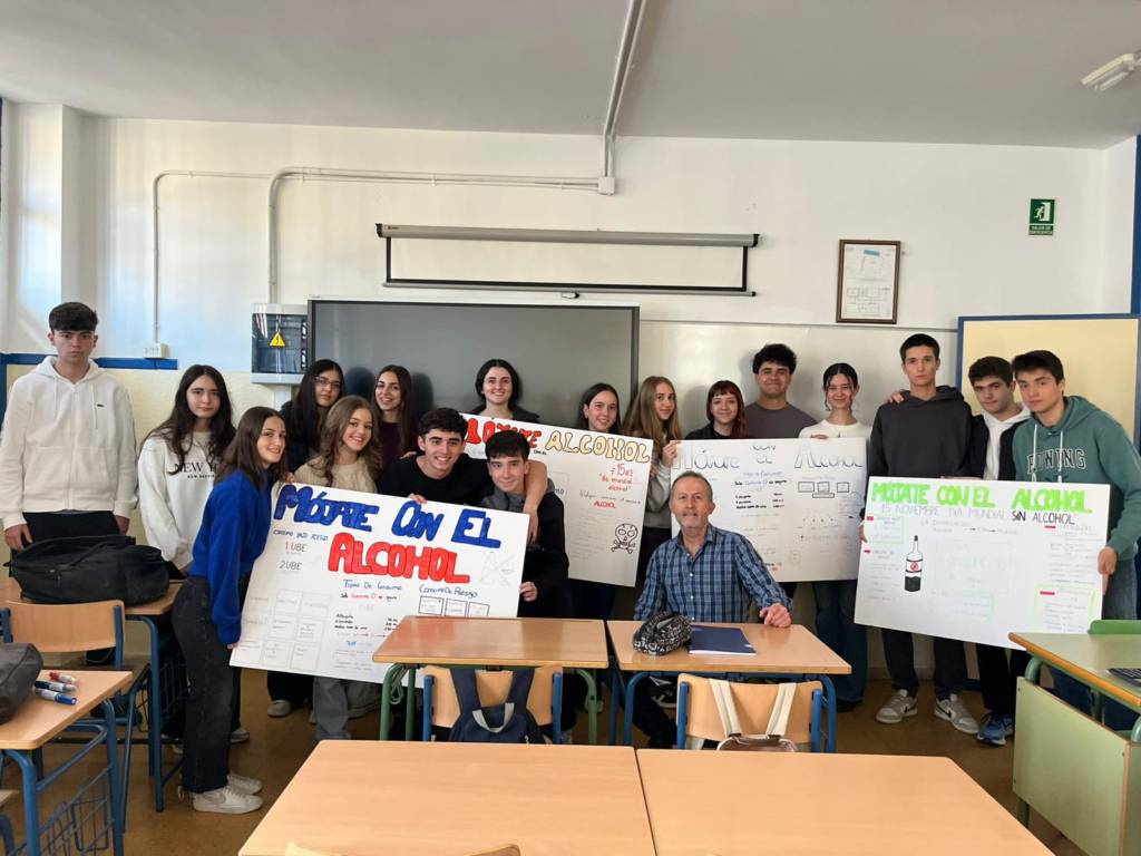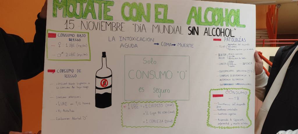 El 15 de noviembre se celebra el Día Mundial sin Alcohol, una efeméride que tiene como finalidad concienciar a la población mundial acerca de los daños físicos y psicológicos que ocasiona el consumo de alcohol. Es de vital importancia fomentar la responsabilidad en el consumo de alcohol, especialmente en los jóvenes. Para conmemorar el Día Mundial sin alcohol y dentro del Programa “Hábitos de Vida Saludable”, nuestro alumnado de 1º bachillerato de ciencias realizó un taller los días 15 y 20 de noviembre sobre el alcohol, taller propuesto e impartido por nuestra referente sanitaria, Ana Fernández Arias, y dos enfermeras estudiantes del cuarto curso, Alicia Sáez y Nuria Aybar. En dicho taller trataron aspectos relacionados con los daños que ocasiona el consumo de alcohol y fomentar un consumo responsable del mismo, y todo ello quedó reflejado en unos collages que elaboraron los alumnos/as. El viernes 21 de noviembre estos alumnos/as de 1º Bachillerato de ciencias actuaron como Mediadores de Salud. Utilizaron los collages para explicar todos estos aspectos relacionados con el alcohol - daños físicos y psicológicos, consumo responsable… - al resto de alumnado del centro, alumnos/as de FPB Específica, ESO y Bachillerato. Queremos agradecer a Ana Fernández Arias, Alicia Sáez y Nuria Aybar su implicación en el centro en todos los aspectos relacionados con la salud y agradecer también al profesorado por colaborar en dicha actividad.